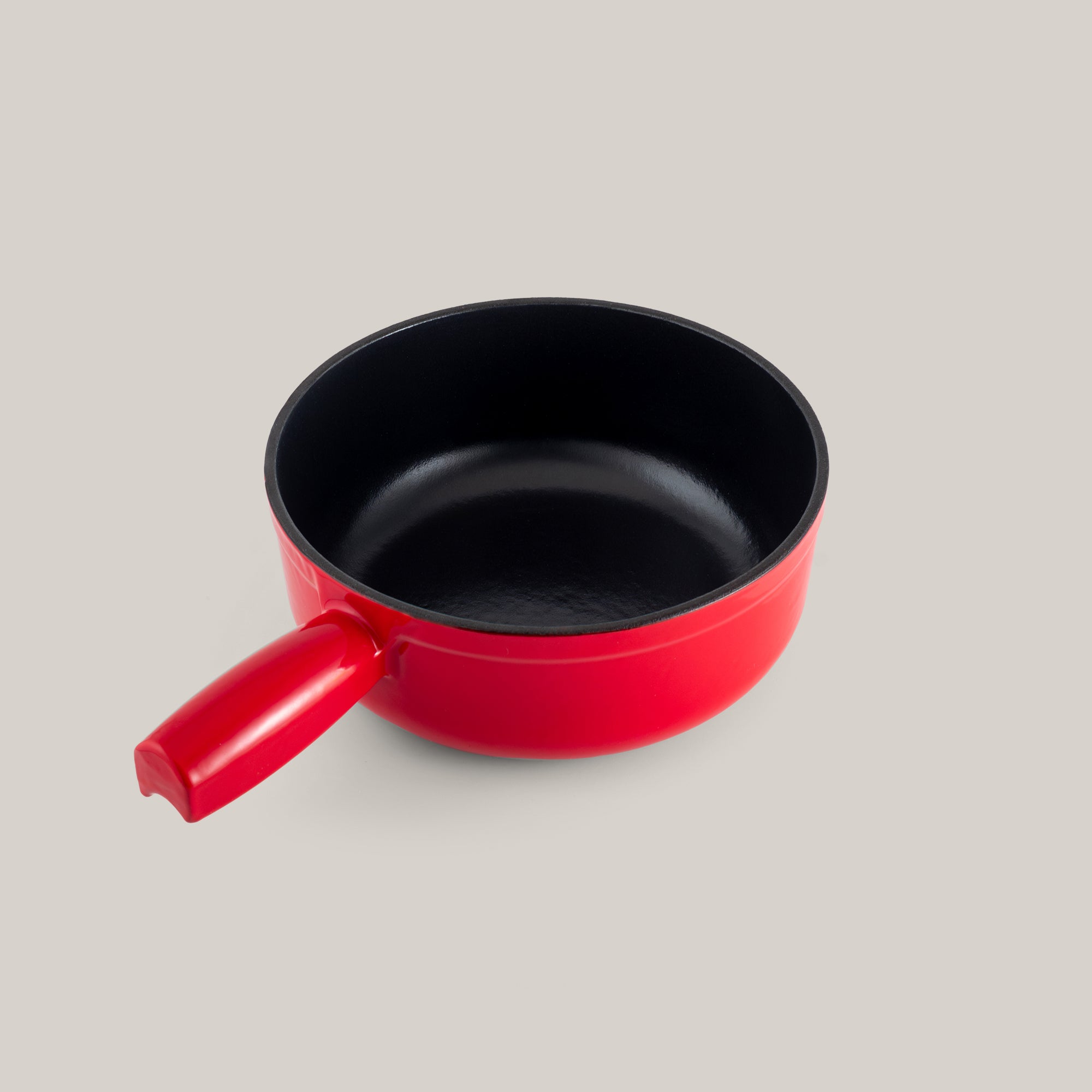 Classic Swiss caquelon-shaped cast iron pot with a stylish red enamel finish, perfect for any family dinners and gatherings.