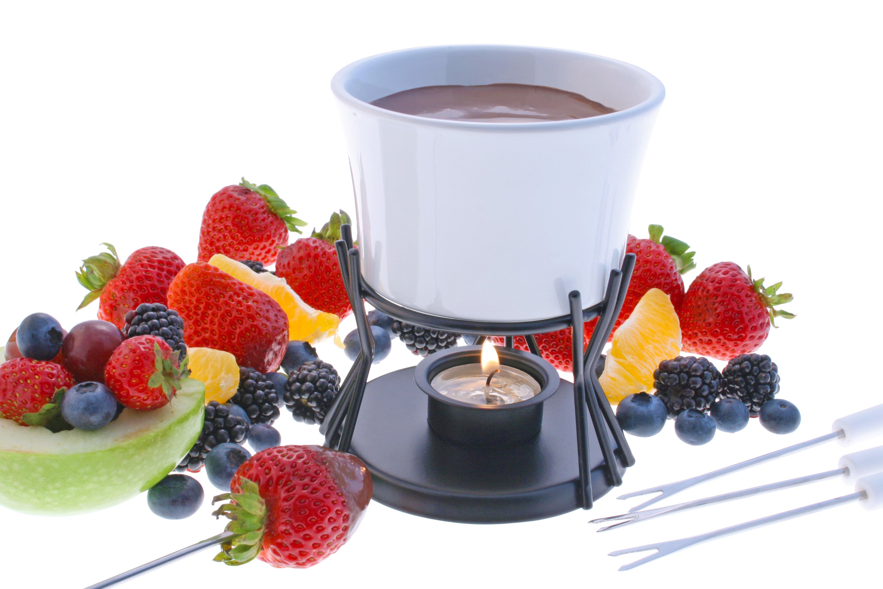 The black metal stand holds a tea light candle to gently heat the chocolate, keeping it at the perfect consistency for dipping. Four two-pronged fondue forks with plastic handles make it easy to enjoy everything from fruits to marshmallows. Packaged in a gift box, this fondue set is also a charming gift idea. Candlelight fondue can also be used for cheese.