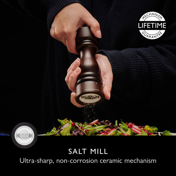 Featuring Cole & Mason’s innovative grind select functionality, the pepper mill comes with 6 grind settings and the salt mill with 3. By moving the grind select band along the dots, you can easily change the grind from fine to coarse, giving you complete control when seasoning your dishes. Covered by a lifetime guarantee, pepper mills are fitted with the Cole & Mason design registered Precision+ carbon steel mechanism, salt mills are fitted with an ultra-sharp, anti-corrosion ceramic mechanism.