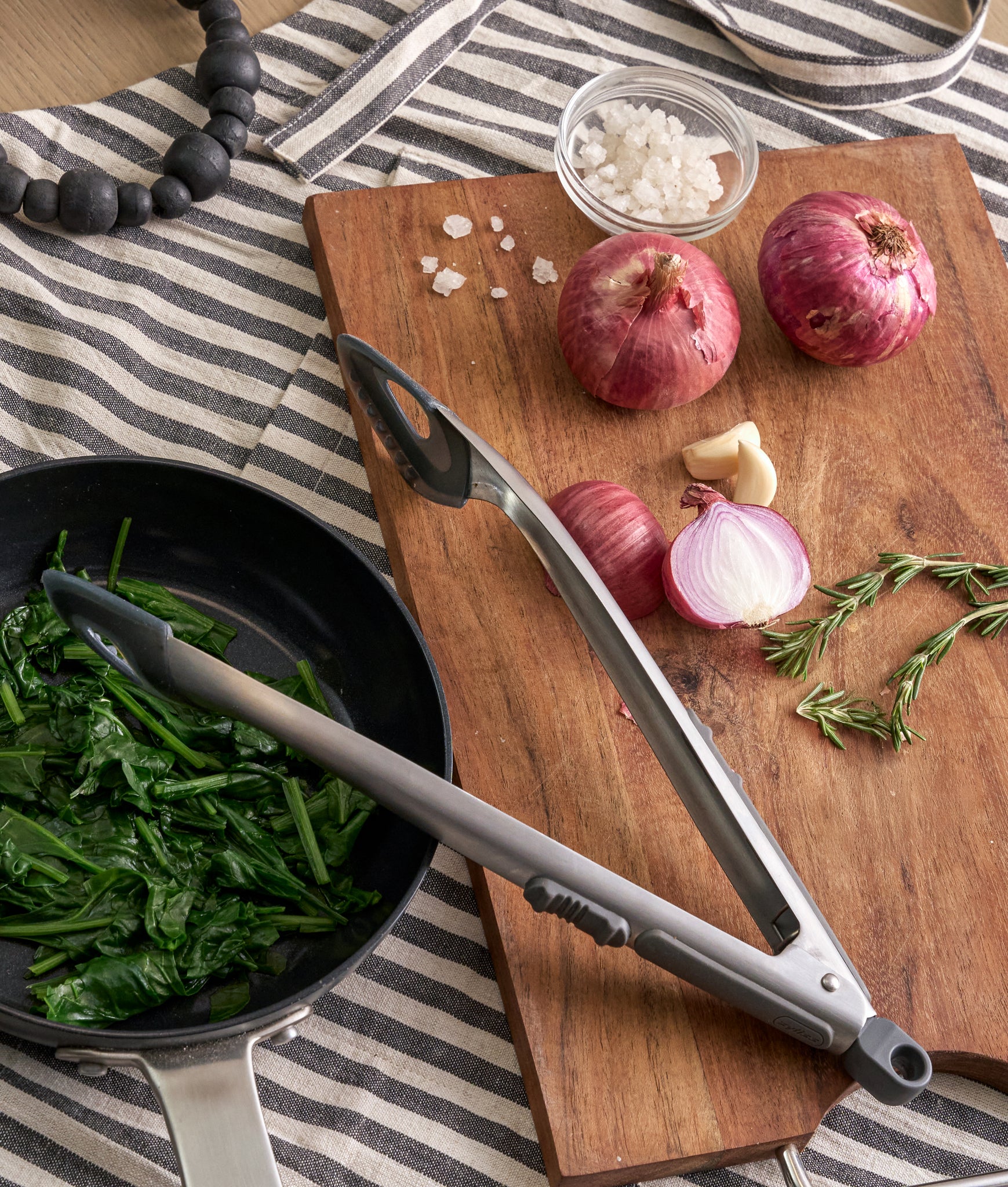 The Zyliss Silicone-Tipped Tongs are ideal for cooking, stirring and serving! Designed for one-handed use, these silicone-tipped tongs lock with a slide of the button located on the side of tool.