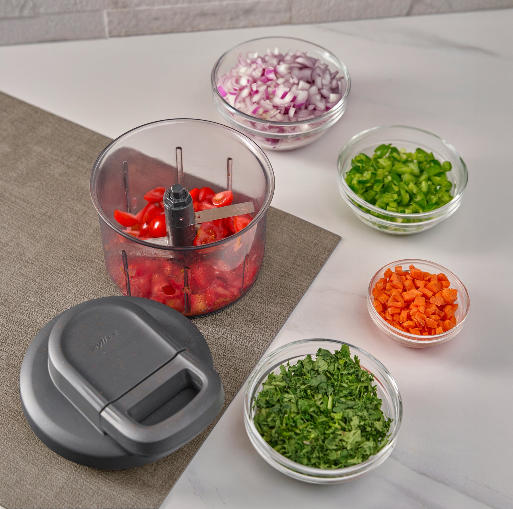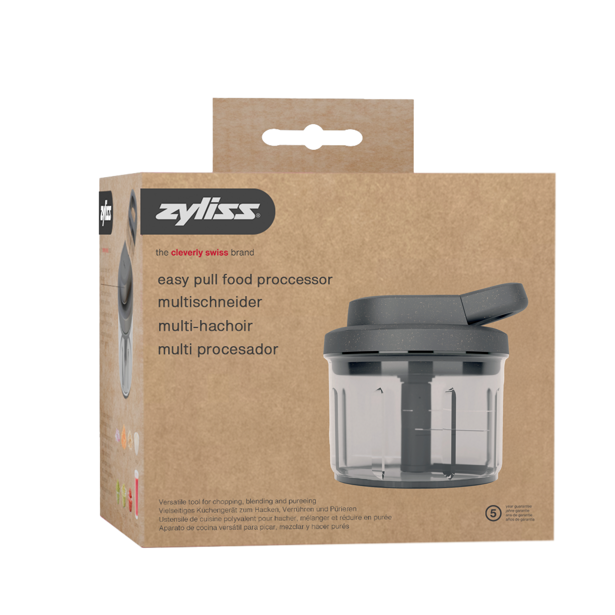 The Zyliss Easy Pull Food Processor is a compact, manual tool designed for a variety of everyday food prep tasks. Its pull-cord mechanism spins ultra-sharp stainless steel blades to chop, mix or blend ingredients with precision—giving you full control over the desired texture, from a coarse chop to a fine blend.