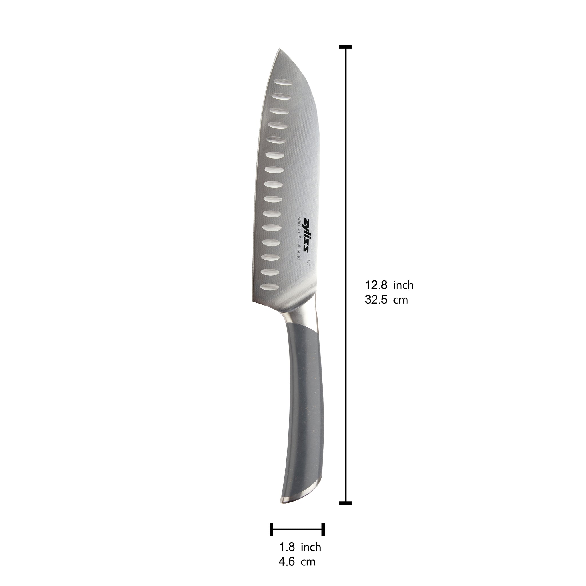 • Shallow Granton-style indents along the side of the blade help reduce food from sticking to the blade