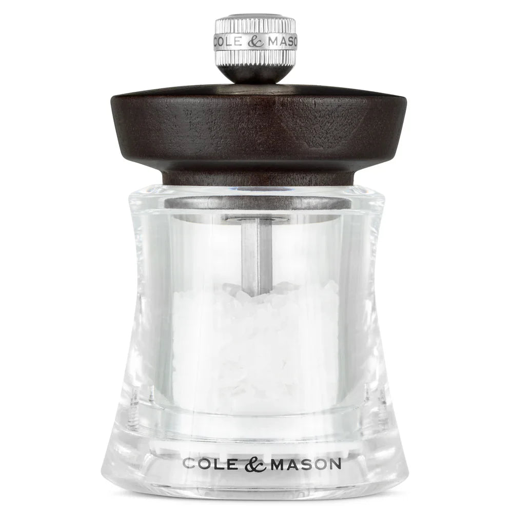 The Holborn Mill, made from durable acrylic and high-quality beech wood, stands 9 cm / 3.5 inches tall with a sleek design and stainless-steel collar.