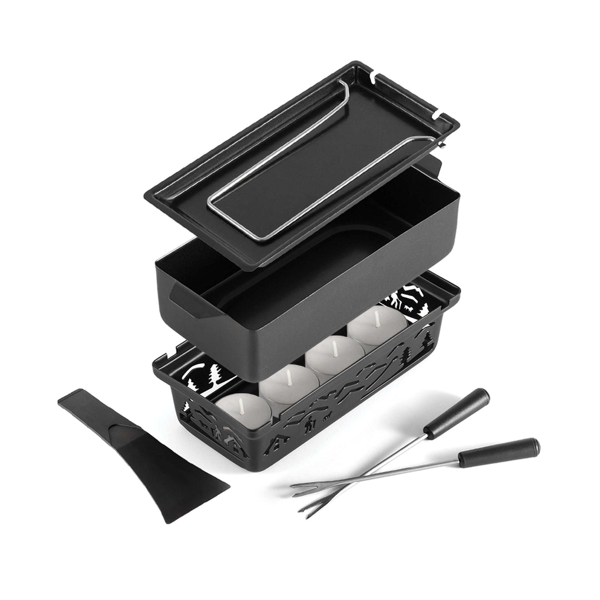 Perfect for intimate dinners, cozy nights, or small gatherings, this versatile set lets you enjoy both creamy fondue and delicious raclette in one compact system. The tea light candle heating ensures gentle, even cooking without the need for electricity, making it portable, eco-friendly, and easy to set up anywhere.