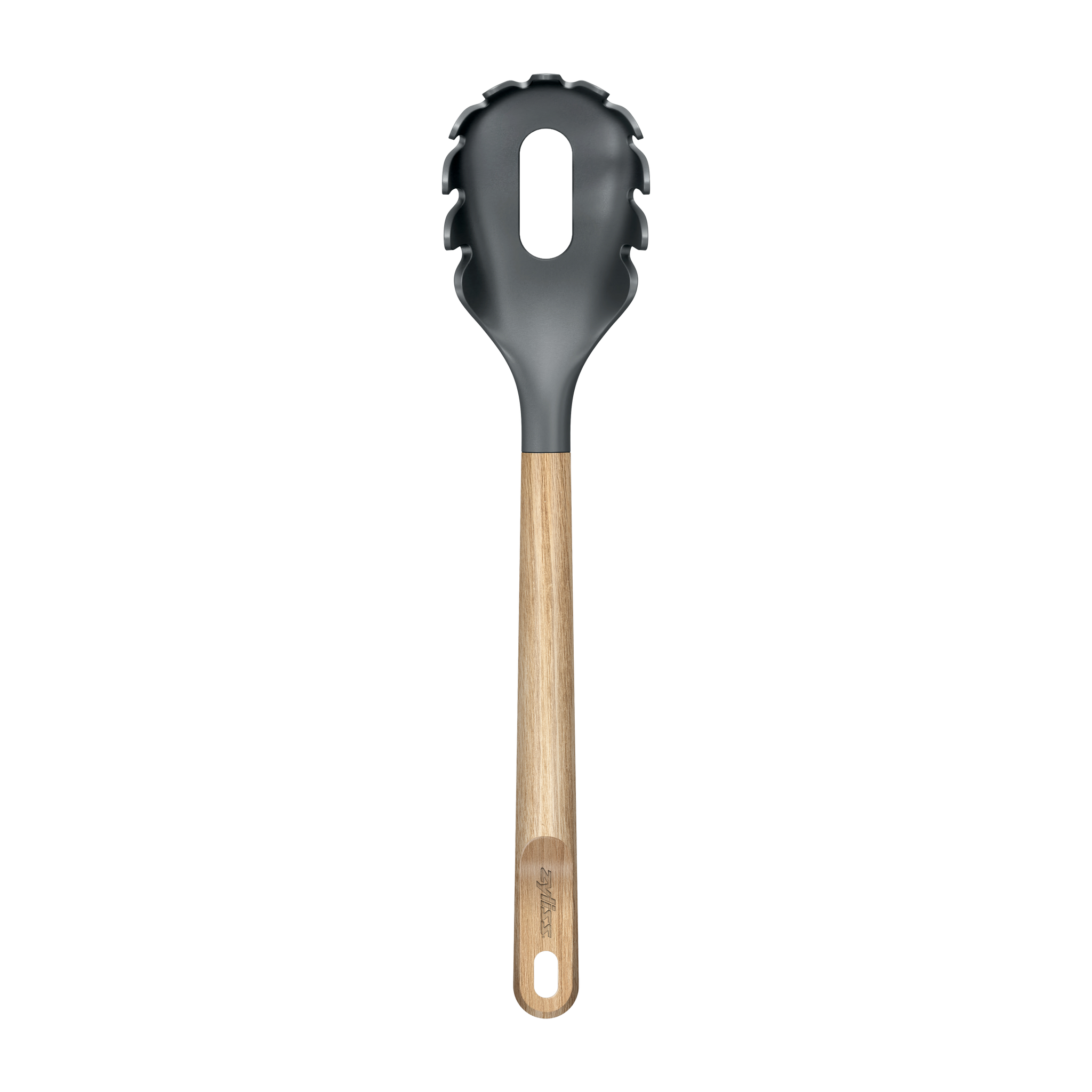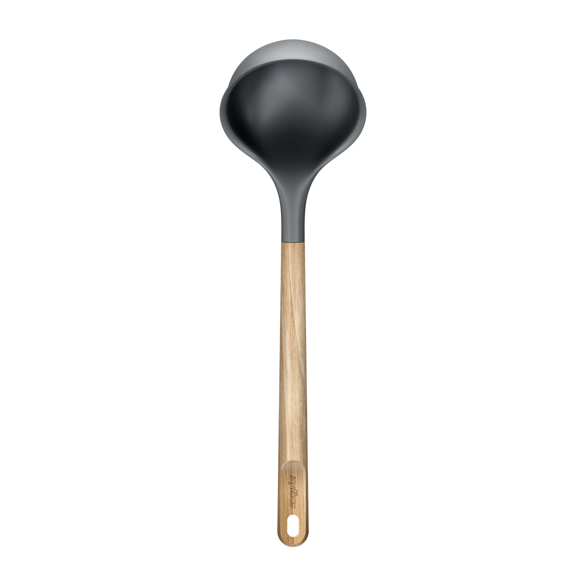The Zyliss Oak Wood Ladle features a durable oak wood handle with heat resistance up to 150°C. The deep ladle head is made of PBT, heat resistant up to 200°C / 392°F, with a flexible silicone edge that withstands up to 200°C / 392°F.