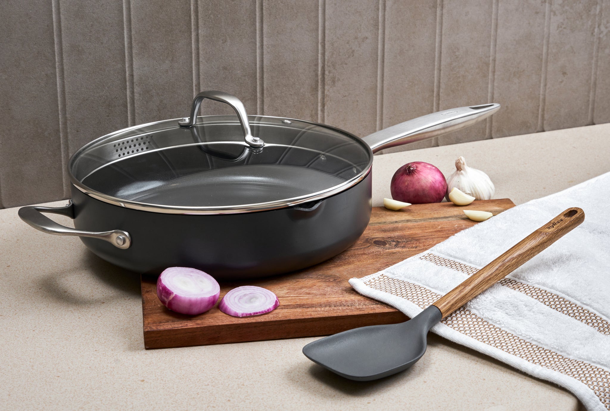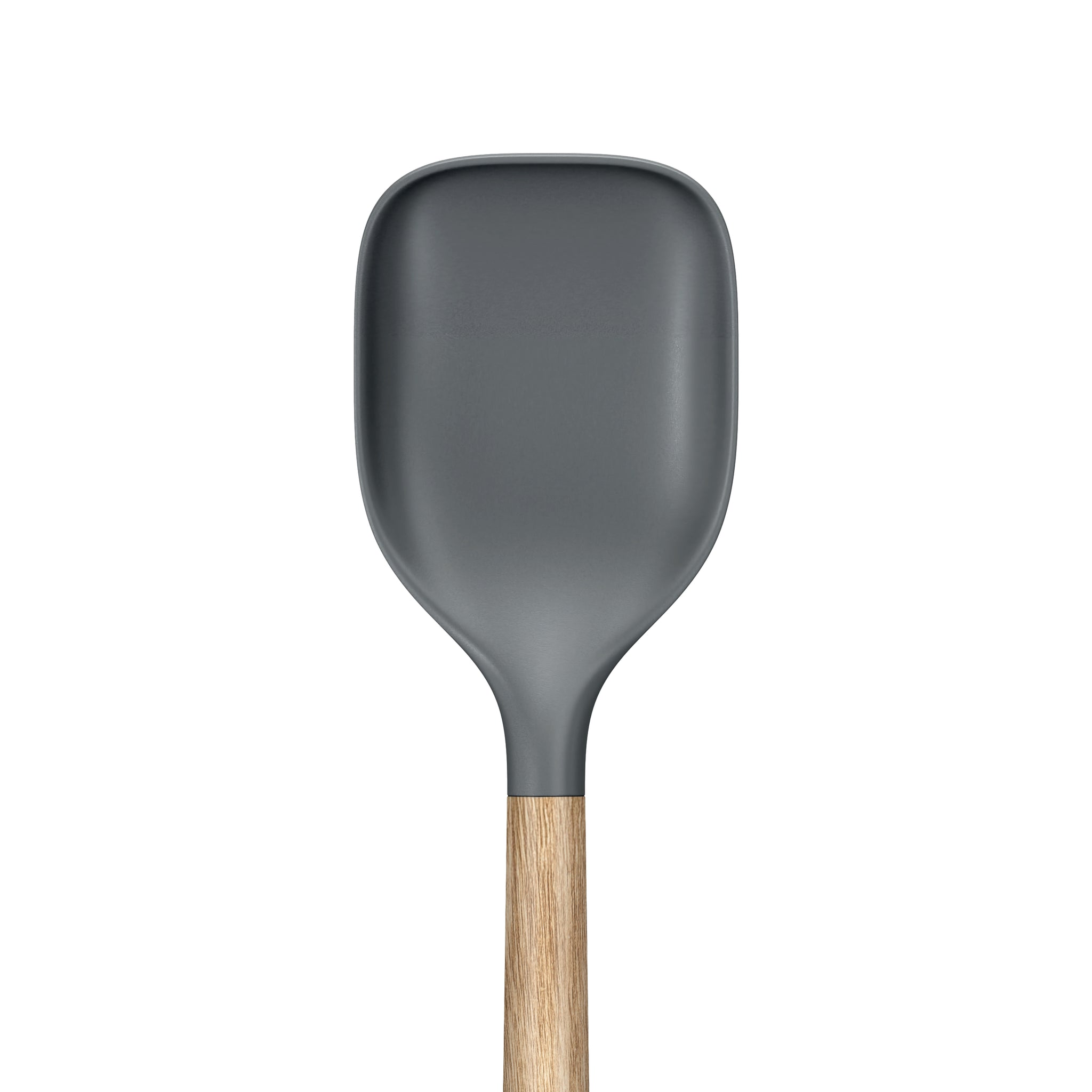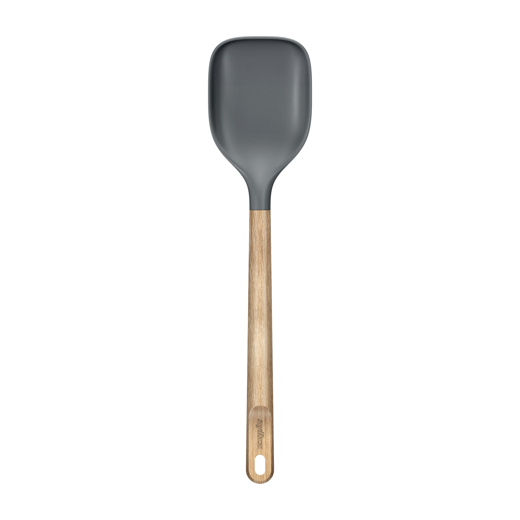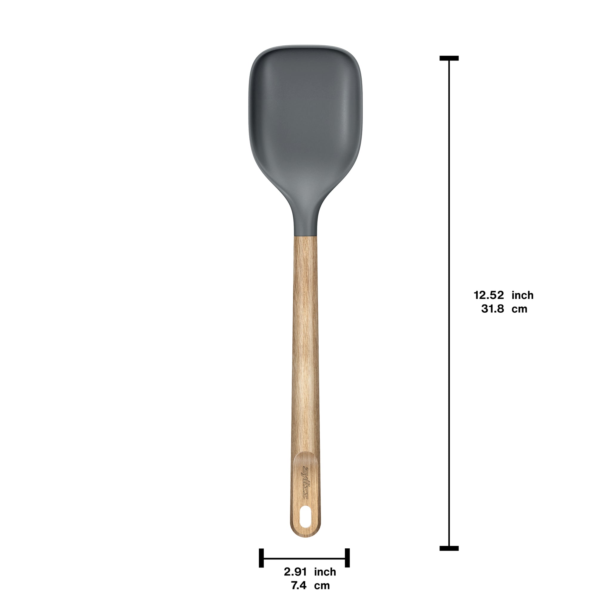 The Zyliss Oak Wood Spoon L features a durable oak wood handle with heat resistance up to 150°C. The spoon head is made of PBT, heat resistant up to 200°C / 392°F, with a flexible silicone edge that withstands up to 200°C / 392°F.
